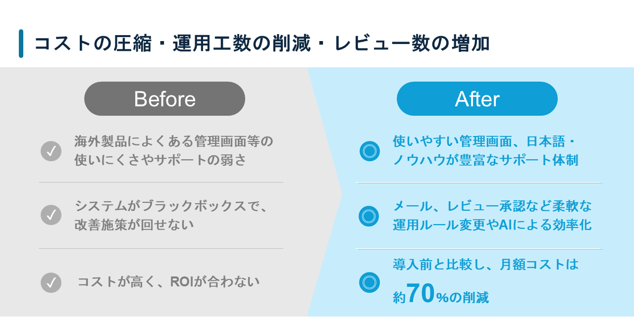 例えば、レビューのリクエストメールが購入者全員にきちんと送られているのか詳細が把握できず、改善のサイクルが回しにくく、コスト面でもROI(投資対効果)が合わないと感じていました。