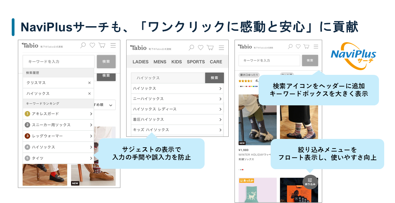 同社ではレビュー基盤の刷新と平行して「NaviPlusサーチ」も導入した。検索窓にキーワードを入力すると、サジェスト(予測変換)が表示され、入力の手間や誤入力を防ぐ。さらに、「ハイソックス レディース」「着圧ハイソックス」といったキーワードランキングの表示や、絞り込みメニューの改善により、ユーザビリティが大幅に向上した。